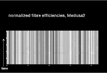 Each transmission vector is normalized to give the same average transmission (excluding broken fibres), so that subtle normalization differences hopefully cancel out and the rms values indeed reflect fibre instabilities only. The two plots on top display the following: