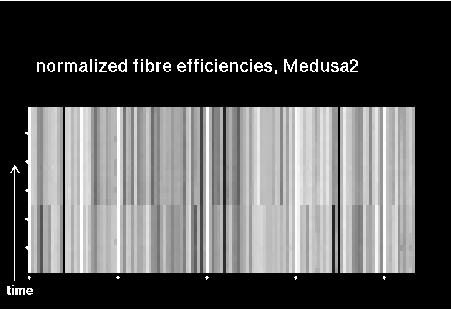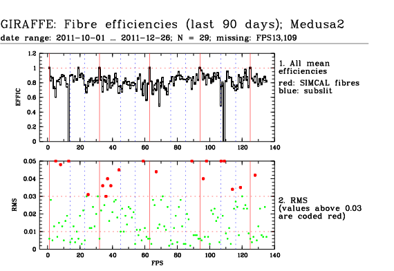 This is the trending plot for monitoring response and stability of the Giraffe fibres. Its purpose is to identify and monitor both fibre efficiency and stability. It helps identifying fibres with particularly low response, or unstable response. This may be useful e.g. for assigning sky fibres in the Medusa case. Input data are the Health Check fibre flats taken approximately every third day for the Medusa slits, and once a week for the IFu and Argus slits. The pipeline extracts the fibre signals and calculates relative efficiencies per fibre (normalized). These are averaged in chromatic (Y) direction and stored in a binary table, as a single transmission, or response, value per fibre. This table is appended as extension #1 to the product files with pro.catg=FF_EXTSPECTRA. Note that all of these files are robotic flats. Nasmyth flats are not included here because of their irregular acquisition, despite their better illumination pattern. The transmission numbers (columns FPS = fibre position index, and TRANSMISSION) are collected for all HC flats of a given 3 month period. Contrary to traditional QC parameters, they form a QC vector: one set of 135 (Medusa) or 317 (IFU, Argus) QC values per measurement. They are analyzed numerically to extract, per fibre, the following parameters: