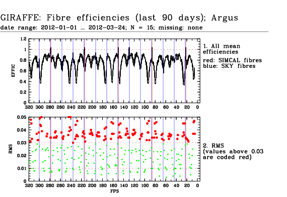 This is the trending plot for monitoring response and stability of the Giraffe fibres. Its purpose is to identify and monitor both fibre efficiency and stability. It helps identifying fibres with particularly low response, or unstable response. This may be useful e.g. for assigning sky fibres in the Medusa case. Input data are the Health Check fibre flats taken approximately every third day for the Medusa slits, and once a week for the IFu and Argus slits. The pipeline extracts the fibre signals and calculates relative efficiencies per fibre (normalized). These are averaged in chromatic (Y) direction and stored in a binary table, as a single transmission, or response, value per fibre. This table is appended as extension #1 to the product files with pro.catg=FF_EXTSPECTRA. Note that all of these files are robotic flats. Nasmyth flats are not included here because of their irregular acquisition, despite their better illumination pattern. The transmission numbers (columns FPS = fibre position index, and TRANSMISSION) are collected for all HC flats of a given 3 month period. Contrary to traditional QC parameters, they form a QC vector: one set of 135 (Medusa) or 317 (IFU, Argus) QC values per measurement. They are analyzed numerically to extract, per fibre, the following parameters: