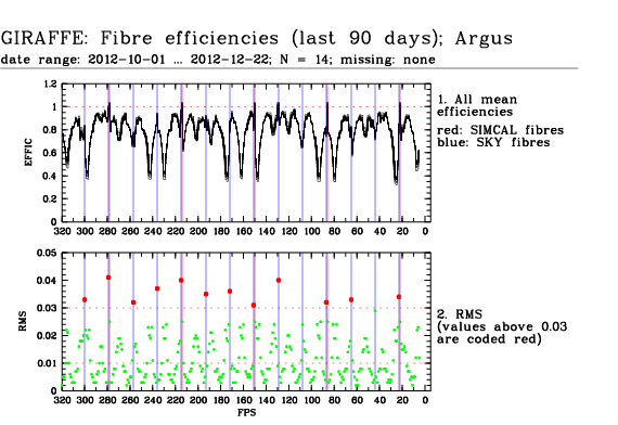 This is the trending plot for monitoring response and stability of the Giraffe fibres. Its purpose is to identify and monitor both fibre efficiency and stability. It helps identifying fibres with particularly low response, or unstable response. This may be useful e.g. for assigning sky fibres in the Medusa case. Input data are the Health Check fibre flats taken approximately every third day for the Medusa slits, and once a week for the IFu and Argus slits. The pipeline extracts the fibre signals and calculates relative efficiencies per fibre (normalized). These are averaged in chromatic (Y) direction and stored in a binary table, as a single transmission, or response, value per fibre. This table is appended as extension #1 to the product files with pro.catg=FF_EXTSPECTRA. Note that all of these files are robotic flats. Nasmyth flats are not included here because of their irregular acquisition, despite their better illumination pattern. The transmission numbers (columns FPS = fibre position index, and TRANSMISSION) are collected for all HC flats of a given 3 month period. Contrary to traditional QC parameters, they form a QC vector: one set of 135 (Medusa) or 317 (IFU, Argus) QC values per measurement. They are analyzed numerically to extract, per fibre, the following parameters: