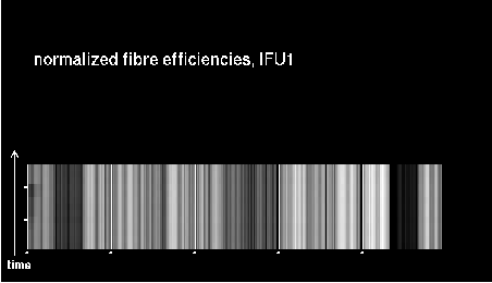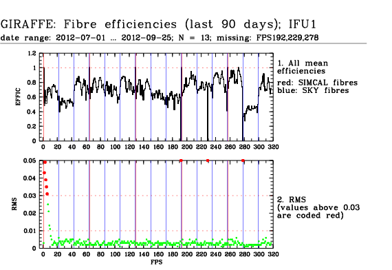 This is the trending plot for monitoring response and stability of the Giraffe fibres. Its purpose is to identify and monitor both fibre efficiency and stability. It helps identifying fibres with particularly low response, or unstable response. This may be useful e.g. for assigning sky fibres in the Medusa case. Input data are the Health Check fibre flats taken approximately every third day for the Medusa slits, and once a week for the IFu and Argus slits. The pipeline extracts the fibre signals and calculates relative efficiencies per fibre (normalized). These are averaged in chromatic (Y) direction and stored in a binary table, as a single transmission, or response, value per fibre. This table is appended as extension #1 to the product files with pro.catg=FF_EXTSPECTRA. Note that all of these files are robotic flats. Nasmyth flats are not included here because of their irregular acquisition, despite their better illumination pattern. The transmission numbers (columns FPS = fibre position index, and TRANSMISSION) are collected for all HC flats of a given 3 month period. Contrary to traditional QC parameters, they form a QC vector: one set of 135 (Medusa) or 317 (IFU, Argus) QC values per measurement. They are analyzed numerically to extract, per fibre, the following parameters: