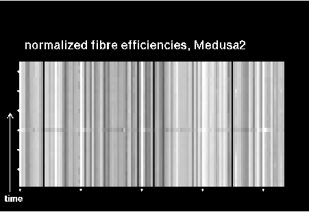 This is the trending plot for monitoring response and stability of the Giraffe fibres. Its purpose is to identify and monitor both fibre efficiency and stability. It helps identifying fibres with particularly low response, or unstable response. This may be useful e.g. for assigning sky fibres in the Medusa case. Input data are the Health Check fibre flats taken approximately every third day for the Medusa slits, and once a week for the IFu and Argus slits. The pipeline extracts the fibre signals and calculates relative efficiencies per fibre (normalized). These are averaged in chromatic (Y) direction and stored in a binary table, as a single transmission, or response, value per fibre. This table is appended as extension #1 to the product files with pro.catg=FF_EXTSPECTRA. Note that all of these files are robotic flats. Nasmyth flats are not included here because of their irregular acquisition, despite their better illumination pattern. The transmission numbers (columns FPS = fibre position index, and TRANSMISSION) are collected for all HC flats of a given 3 month period. Contrary to traditional QC parameters, they form a QC vector: one set of 135 (Medusa) or 317 (IFU, Argus) QC values per measurement. They are analyzed numerically to extract, per fibre, the following parameters: