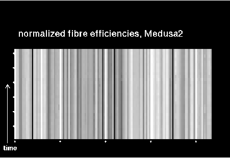Each transmission vector is normalized to give the same average transmission (excluding broken fibres), so that subtle normalization differences hopefully cancel out and the rms values indeed reflect fibre instabilities only. The two plots on top display the following: