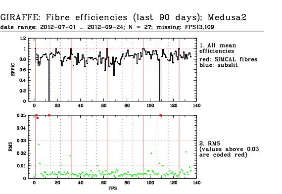 This is the trending plot for monitoring response and stability of the Giraffe fibres. Its purpose is to identify and monitor both fibre efficiency and stability. It helps identifying fibres with particularly low response, or unstable response. This may be useful e.g. for assigning sky fibres in the Medusa case. Input data are the Health Check fibre flats taken approximately every third day for the Medusa slits, and once a week for the IFu and Argus slits. The pipeline extracts the fibre signals and calculates relative efficiencies per fibre (normalized). These are averaged in chromatic (Y) direction and stored in a binary table, as a single transmission, or response, value per fibre. This table is appended as extension #1 to the product files with pro.catg=FF_EXTSPECTRA. Note that all of these files are robotic flats. Nasmyth flats are not included here because of their irregular acquisition, despite their better illumination pattern. The transmission numbers (columns FPS = fibre position index, and TRANSMISSION) are collected for all HC flats of a given 3 month period. Contrary to traditional QC parameters, they form a QC vector: one set of 135 (Medusa) or 317 (IFU, Argus) QC values per measurement. They are analyzed numerically to extract, per fibre, the following parameters: