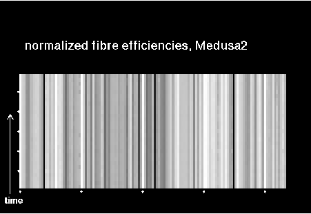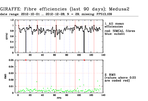 This is the trending plot for monitoring response and stability of the Giraffe fibres. Its purpose is to identify and monitor both fibre efficiency and stability. It helps identifying fibres with particularly low response, or unstable response. This may be useful e.g. for assigning sky fibres in the Medusa case. Input data are the Health Check fibre flats taken approximately every third day for the Medusa slits, and once a week for the IFu and Argus slits. The pipeline extracts the fibre signals and calculates relative efficiencies per fibre (normalized). These are averaged in chromatic (Y) direction and stored in a binary table, as a single transmission, or response, value per fibre. This table is appended as extension #1 to the product files with pro.catg=FF_EXTSPECTRA. Note that all of these files are robotic flats. Nasmyth flats are not included here because of their irregular acquisition, despite their better illumination pattern. The transmission numbers (columns FPS = fibre position index, and TRANSMISSION) are collected for all HC flats of a given 3 month period. Contrary to traditional QC parameters, they form a QC vector: one set of 135 (Medusa) or 317 (IFU, Argus) QC values per measurement. They are analyzed numerically to extract, per fibre, the following parameters: