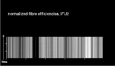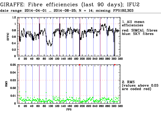This is the trending plot for monitoring response and stability of the Giraffe fibres. Its purpose is to identify and monitor both fibre efficiency and stability. It helps identifying fibres with particularly low response, or unstable response. This may be useful e.g. for assigning sky fibres in the Medusa case. Input data are the Health Check fibre flats taken approximately every third day for the Medusa slits, and once a week for the IFu and Argus slits. The pipeline extracts the fibre signals and calculates relative efficiencies per fibre (normalized). These are averaged in chromatic (Y) direction and stored in a binary table, as a single transmission, or response, value per fibre. This table is appended as extension #1 to the product files with pro.catg=FF_EXTSPECTRA. Note that all of these files are robotic flats. Nasmyth flats are not included here because of their irregular acquisition, despite their better illumination pattern. The transmission numbers (columns FPS = fibre position index, and TRANSMISSION) are collected for all HC flats of a given 3 month period. Contrary to traditional QC parameters, they form a QC vector: one set of 135 (Medusa) or 317 (IFU, Argus) QC values per measurement. They are analyzed numerically to extract, per fibre, the following parameters: