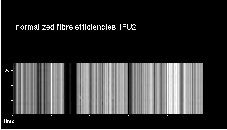 This is the trending plot for monitoring response and stability of the Giraffe fibres. Its purpose is to identify and monitor both fibre efficiency and stability. It helps identifying fibres with particularly low response, or unstable response. This may be useful e.g. for assigning sky fibres in the Medusa case. Input data are the Health Check fibre flats taken approximately every third day for the Medusa slits, and once a week for the IFu and Argus slits. The pipeline extracts the fibre signals and calculates relative efficiencies per fibre (normalized). These are averaged in chromatic (Y) direction and stored in a binary table, as a single transmission, or response, value per fibre. This table is appended as extension #1 to the product files with pro.catg=FF_EXTSPECTRA. Note that all of these files are robotic flats. Nasmyth flats are not included here because of their irregular acquisition, despite their better illumination pattern. The transmission numbers (columns FPS = fibre position index, and TRANSMISSION) are collected for all HC flats of a given 3 month period. Contrary to traditional QC parameters, they form a QC vector: one set of 135 (Medusa) or 317 (IFU, Argus) QC values per measurement. They are analyzed numerically to extract, per fibre, the following parameters: