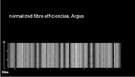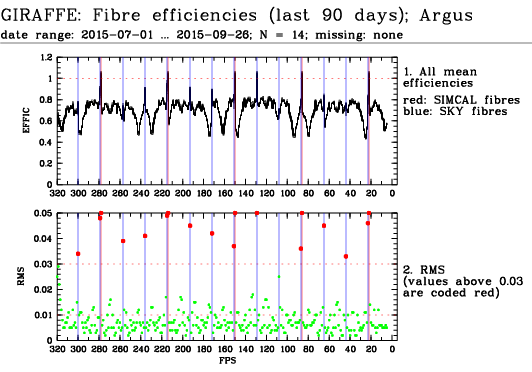 This is the trending plot for monitoring response and stability of the Giraffe fibres. Its purpose is to identify and monitor both fibre efficiency and stability. It helps identifying fibres with particularly low response, or unstable response. This may be useful e.g. for assigning sky fibres in the Medusa case. Input data are the Health Check fibre flats taken approximately every third day for the Medusa slits, and once a week for the IFu and Argus slits. The pipeline extracts the fibre signals and calculates relative efficiencies per fibre (normalized). These are averaged in chromatic (Y) direction and stored in a binary table, as a single transmission, or response, value per fibre. This table is appended as extension #1 to the product files with pro.catg=FF_EXTSPECTRA. Note that all of these files are robotic flats. Nasmyth flats are not included here because of their irregular acquisition, despite their better illumination pattern. The transmission numbers (columns FPS = fibre position index, and TRANSMISSION) are collected for all HC flats of a given 3 month period. Contrary to traditional QC parameters, they form a QC vector: one set of 135 (Medusa) or 317 (IFU, Argus) QC values per measurement. They are analyzed numerically to extract, per fibre, the following parameters: