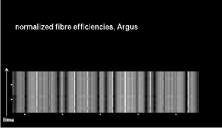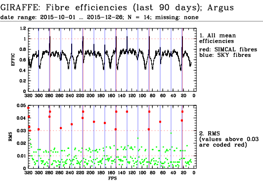This is the trending plot for monitoring response and stability of the Giraffe fibres. Its purpose is to identify and monitor both fibre efficiency and stability. It helps identifying fibres with particularly low response, or unstable response. This may be useful e.g. for assigning sky fibres in the Medusa case. Input data are the Health Check fibre flats taken approximately every third day for the Medusa slits, and once a week for the IFu and Argus slits. The pipeline extracts the fibre signals and calculates relative efficiencies per fibre (normalized). These are averaged in chromatic (Y) direction and stored in a binary table, as a single transmission, or response, value per fibre. This table is appended as extension #1 to the product files with pro.catg=FF_EXTSPECTRA. Note that all of these files are robotic flats. Nasmyth flats are not included here because of their irregular acquisition, despite their better illumination pattern. The transmission numbers (columns FPS = fibre position index, and TRANSMISSION) are collected for all HC flats of a given 3 month period. Contrary to traditional QC parameters, they form a QC vector: one set of 135 (Medusa) or 317 (IFU, Argus) QC values per measurement. They are analyzed numerically to extract, per fibre, the following parameters: