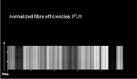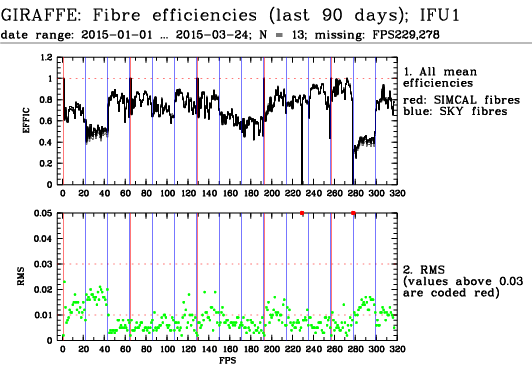 This is the trending plot for monitoring response and stability of the Giraffe fibres. Its purpose is to identify and monitor both fibre efficiency and stability. It helps identifying fibres with particularly low response, or unstable response. This may be useful e.g. for assigning sky fibres in the Medusa case. Input data are the Health Check fibre flats taken approximately every third day for the Medusa slits, and once a week for the IFu and Argus slits. The pipeline extracts the fibre signals and calculates relative efficiencies per fibre (normalized). These are averaged in chromatic (Y) direction and stored in a binary table, as a single transmission, or response, value per fibre. This table is appended as extension #1 to the product files with pro.catg=FF_EXTSPECTRA. Note that all of these files are robotic flats. Nasmyth flats are not included here because of their irregular acquisition, despite their better illumination pattern. The transmission numbers (columns FPS = fibre position index, and TRANSMISSION) are collected for all HC flats of a given 3 month period. Contrary to traditional QC parameters, they form a QC vector: one set of 135 (Medusa) or 317 (IFU, Argus) QC values per measurement. They are analyzed numerically to extract, per fibre, the following parameters: