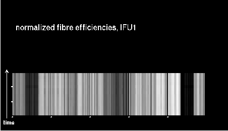 This is the trending plot for monitoring response and stability of the Giraffe fibres. Its purpose is to identify and monitor both fibre efficiency and stability. It helps identifying fibres with particularly low response, or unstable response. This may be useful e.g. for assigning sky fibres in the Medusa case. Input data are the Health Check fibre flats taken approximately every third day for the Medusa slits, and once a week for the IFu and Argus slits. The pipeline extracts the fibre signals and calculates relative efficiencies per fibre (normalized). These are averaged in chromatic (Y) direction and stored in a binary table, as a single transmission, or response, value per fibre. This table is appended as extension #1 to the product files with pro.catg=FF_EXTSPECTRA. Note that all of these files are robotic flats. Nasmyth flats are not included here because of their irregular acquisition, despite their better illumination pattern. The transmission numbers (columns FPS = fibre position index, and TRANSMISSION) are collected for all HC flats of a given 3 month period. Contrary to traditional QC parameters, they form a QC vector: one set of 135 (Medusa) or 317 (IFU, Argus) QC values per measurement. They are analyzed numerically to extract, per fibre, the following parameters:
