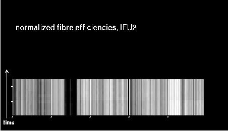 This is the trending plot for monitoring response and stability of the Giraffe fibres. Its purpose is to identify and monitor both fibre efficiency and stability. It helps identifying fibres with particularly low response, or unstable response. This may be useful e.g. for assigning sky fibres in the Medusa case. Input data are the Health Check fibre flats taken approximately every third day for the Medusa slits, and once a week for the IFu and Argus slits. The pipeline extracts the fibre signals and calculates relative efficiencies per fibre (normalized). These are averaged in chromatic (Y) direction and stored in a binary table, as a single transmission, or response, value per fibre. This table is appended as extension #1 to the product files with pro.catg=FF_EXTSPECTRA. Note that all of these files are robotic flats. Nasmyth flats are not included here because of their irregular acquisition, despite their better illumination pattern. The transmission numbers (columns FPS = fibre position index, and TRANSMISSION) are collected for all HC flats of a given 3 month period. Contrary to traditional QC parameters, they form a QC vector: one set of 135 (Medusa) or 317 (IFU, Argus) QC values per measurement. They are analyzed numerically to extract, per fibre, the following parameters: