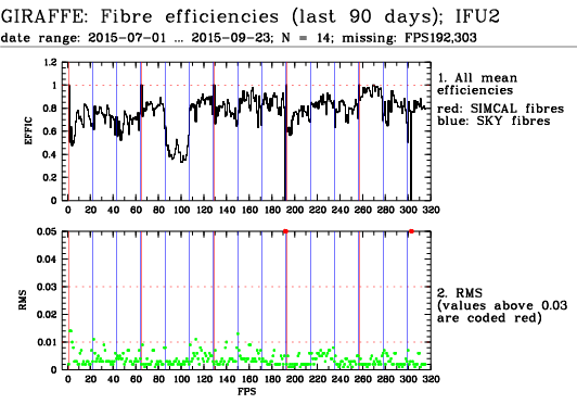 This is the trending plot for monitoring response and stability of the Giraffe fibres. Its purpose is to identify and monitor both fibre efficiency and stability. It helps identifying fibres with particularly low response, or unstable response. This may be useful e.g. for assigning sky fibres in the Medusa case. Input data are the Health Check fibre flats taken approximately every third day for the Medusa slits, and once a week for the IFu and Argus slits. The pipeline extracts the fibre signals and calculates relative efficiencies per fibre (normalized). These are averaged in chromatic (Y) direction and stored in a binary table, as a single transmission, or response, value per fibre. This table is appended as extension #1 to the product files with pro.catg=FF_EXTSPECTRA. Note that all of these files are robotic flats. Nasmyth flats are not included here because of their irregular acquisition, despite their better illumination pattern. The transmission numbers (columns FPS = fibre position index, and TRANSMISSION) are collected for all HC flats of a given 3 month period. Contrary to traditional QC parameters, they form a QC vector: one set of 135 (Medusa) or 317 (IFU, Argus) QC values per measurement. They are analyzed numerically to extract, per fibre, the following parameters: