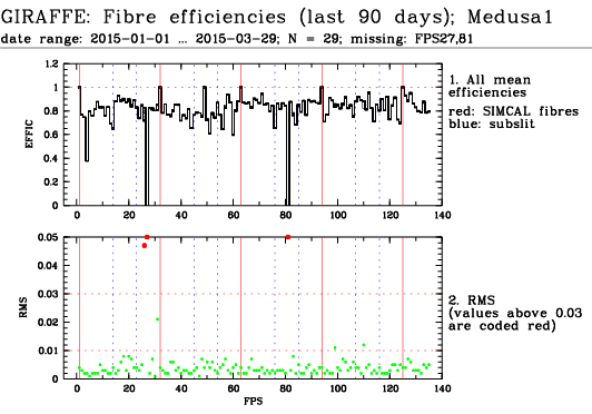 This is the trending plot for monitoring response and stability of the Giraffe fibres. Its purpose is to identify and monitor both fibre efficiency and stability. It helps identifying fibres with particularly low response, or unstable response. This may be useful e.g. for assigning sky fibres in the Medusa case. Input data are the Health Check fibre flats taken approximately every third day for the Medusa slits, and once a week for the IFu and Argus slits. The pipeline extracts the fibre signals and calculates relative efficiencies per fibre (normalized). These are averaged in chromatic (Y) direction and stored in a binary table, as a single transmission, or response, value per fibre. This table is appended as extension #1 to the product files with pro.catg=FF_EXTSPECTRA. Note that all of these files are robotic flats. Nasmyth flats are not included here because of their irregular acquisition, despite their better illumination pattern. The transmission numbers (columns FPS = fibre position index, and TRANSMISSION) are collected for all HC flats of a given 3 month period. Contrary to traditional QC parameters, they form a QC vector: one set of 135 (Medusa) or 317 (IFU, Argus) QC values per measurement. They are analyzed numerically to extract, per fibre, the following parameters: