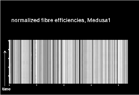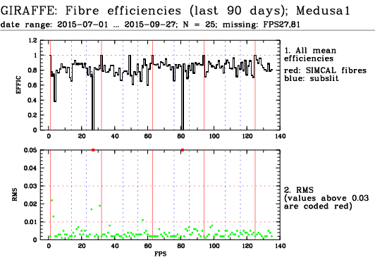 This is the trending plot for monitoring response and stability of the Giraffe fibres. Its purpose is to identify and monitor both fibre efficiency and stability. It helps identifying fibres with particularly low response, or unstable response. This may be useful e.g. for assigning sky fibres in the Medusa case. Input data are the Health Check fibre flats taken approximately every third day for the Medusa slits, and once a week for the IFu and Argus slits. The pipeline extracts the fibre signals and calculates relative efficiencies per fibre (normalized). These are averaged in chromatic (Y) direction and stored in a binary table, as a single transmission, or response, value per fibre. This table is appended as extension #1 to the product files with pro.catg=FF_EXTSPECTRA. Note that all of these files are robotic flats. Nasmyth flats are not included here because of their irregular acquisition, despite their better illumination pattern. The transmission numbers (columns FPS = fibre position index, and TRANSMISSION) are collected for all HC flats of a given 3 month period. Contrary to traditional QC parameters, they form a QC vector: one set of 135 (Medusa) or 317 (IFU, Argus) QC values per measurement. They are analyzed numerically to extract, per fibre, the following parameters: