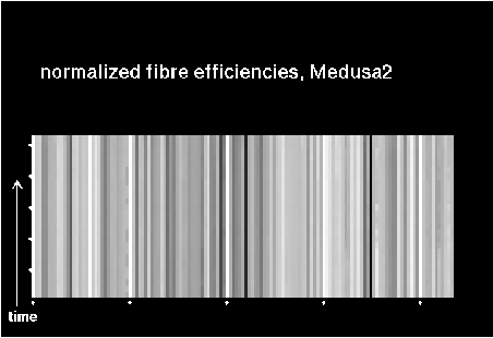Each transmission vector is normalized to give the same average transmission (excluding broken fibres), so that subtle normalization differences hopefully cancel out and the rms values indeed reflect fibre instabilities only. The two plots on top display the following: