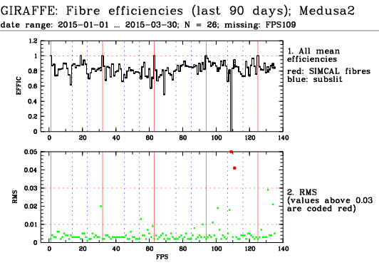This is the trending plot for monitoring response and stability of the Giraffe fibres. Its purpose is to identify and monitor both fibre efficiency and stability. It helps identifying fibres with particularly low response, or unstable response. This may be useful e.g. for assigning sky fibres in the Medusa case. Input data are the Health Check fibre flats taken approximately every third day for the Medusa slits, and once a week for the IFu and Argus slits. The pipeline extracts the fibre signals and calculates relative efficiencies per fibre (normalized). These are averaged in chromatic (Y) direction and stored in a binary table, as a single transmission, or response, value per fibre. This table is appended as extension #1 to the product files with pro.catg=FF_EXTSPECTRA. Note that all of these files are robotic flats. Nasmyth flats are not included here because of their irregular acquisition, despite their better illumination pattern. The transmission numbers (columns FPS = fibre position index, and TRANSMISSION) are collected for all HC flats of a given 3 month period. Contrary to traditional QC parameters, they form a QC vector: one set of 135 (Medusa) or 317 (IFU, Argus) QC values per measurement. They are analyzed numerically to extract, per fibre, the following parameters:
