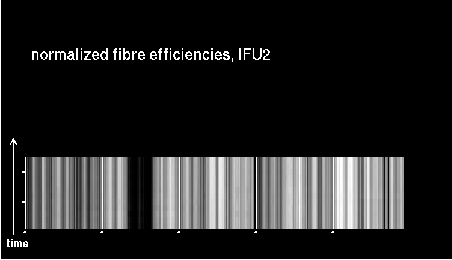 This is the trending plot for monitoring response and stability of the Giraffe fibres. Its purpose is to identify and monitor both fibre efficiency and stability. It helps identifying fibres with particularly low response, or unstable response. This may be useful e.g. for assigning sky fibres in the Medusa case. Input data are the Health Check fibre flats taken approximately every third day for the Medusa slits, and once a week for the IFu and Argus slits. The pipeline extracts the fibre signals and calculates relative efficiencies per fibre (normalized). These are averaged in chromatic (Y) direction and stored in a binary table, as a single transmission, or response, value per fibre. This table is appended as extension #1 to the product files with pro.catg=FF_EXTSPECTRA. Note that all of these files are robotic flats. Nasmyth flats are not included here because of their irregular acquisition, despite their better illumination pattern. The transmission numbers (columns FPS = fibre position index, and TRANSMISSION) are collected for all HC flats of a given 3 month period. Contrary to traditional QC parameters, they form a QC vector: one set of 135 (Medusa) or 317 (IFU, Argus) QC values per measurement. They are analyzed numerically to extract, per fibre, the following parameters: