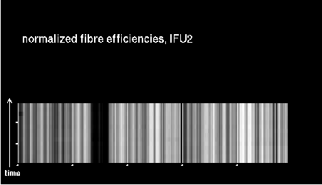 This is the trending plot for monitoring response and stability of the Giraffe fibres. Its purpose is to identify and monitor both fibre efficiency and stability. It helps identifying fibres with particularly low response, or unstable response. This may be useful e.g. for assigning sky fibres in the Medusa case. Input data are the Health Check fibre flats taken approximately every third day for the Medusa slits, and once a week for the IFu and Argus slits. The pipeline extracts the fibre signals and calculates relative efficiencies per fibre (normalized). These are averaged in chromatic (Y) direction and stored in a binary table, as a single transmission, or response, value per fibre. This table is appended as extension #1 to the product files with pro.catg=FF_EXTSPECTRA. Note that all of these files are robotic flats. Nasmyth flats are not included here because of their irregular acquisition, despite their better illumination pattern. The transmission numbers (columns FPS = fibre position index, and TRANSMISSION) are collected for all HC flats of a given 3 month period. Contrary to traditional QC parameters, they form a QC vector: one set of 135 (Medusa) or 317 (IFU, Argus) QC values per measurement. They are analyzed numerically to extract, per fibre, the following parameters: