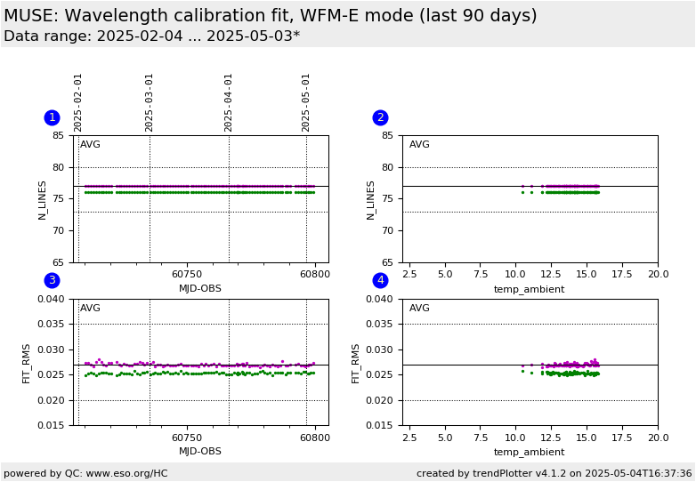 This is MUSE ARC_fit health check plot. The upper panels show the number of identified arc lines used in calibration solution fit in central slice24 (red dots) and border slice1 (blue dots), as a function of time (panels 1) and ambient temperature (panel 3). The lower panels plot the RMS value of the fit for slice24 and slice1 accordingly. Only data points determined from ARC calibrations taken in the instrumental mode (INS.MODE) WFM-NOAO-N and the read out mode (DET.READ.CURNAME) SCI1.0 were selected. The data for each slice are averaged across all detectors (CHANELs).