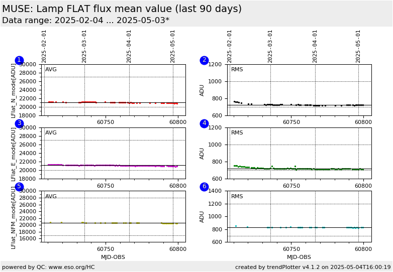 This is the MUSE FLAT_mean health check plot. The left panels show the average value (averaged over all detectors) of the lamp flat flux before normalization as estimated from the master LAMP_FLAT calibrations. The right panels contain rms of the average values. Data taken in the Nominal instrumental mode (INS.MODE) (red/black) and Extended mode (magenta/green), and NFM mode (green/turquoise) are plotted. Only data taken with the read out mode (DET.READ.CURNAME) SCI1.0 are selected.