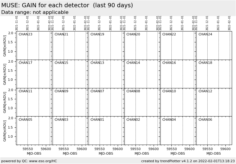 This is MUSE GAIN_det health check plot. The gain is calculated from the DETMON calibrations by the detmon_opt_lp_mr recipe (using the PTC method) in 4 selected regions in 4 different quadrants of each detector.