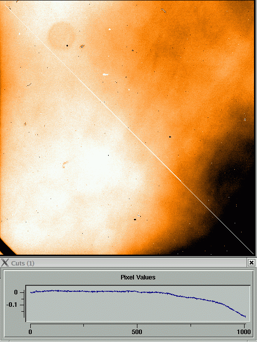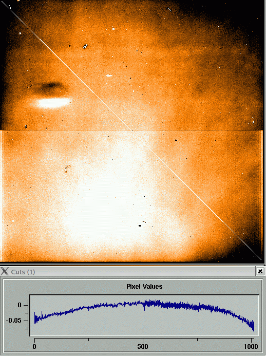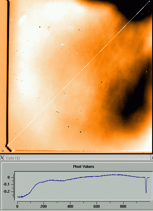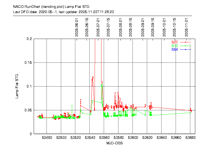 Since June 05, 2005 we've started seeing changed lampflats with dimming at the edges of the field of view. Below are examples of the master calibration frames from that day taken in filter H, cameras S27 and S13. They are difference images where the reference (from 2004-11-05) was subtracted. The corresponding lampflats for other filters - J and Ks, looked similar.