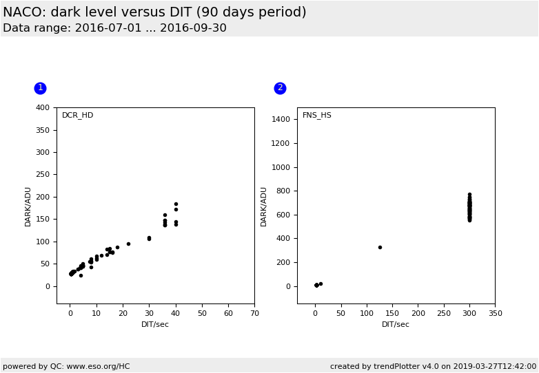 This plot shows the measured dark level as a function of exposure time (DIT) for two