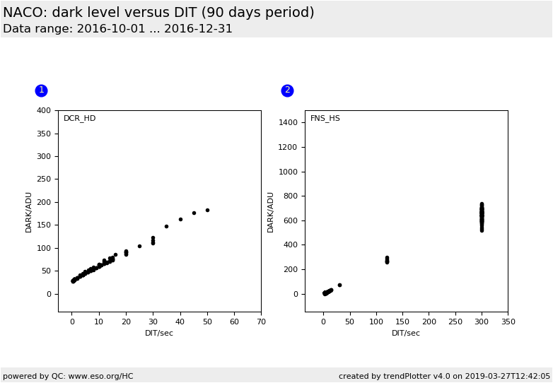 This plot shows the measured dark level as a function of exposure time (DIT) for two