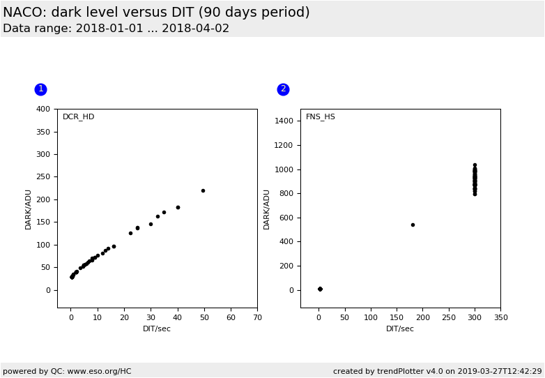 This plot shows the measured dark level as a function of exposure time (DIT) for two