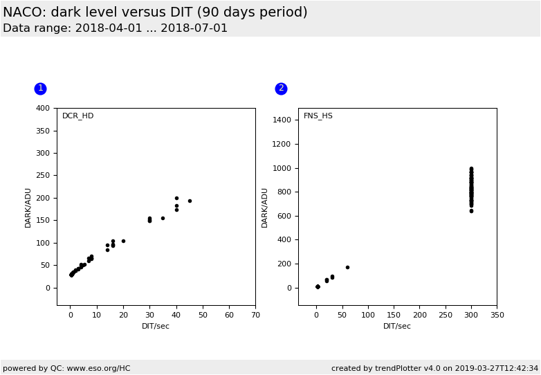 This plot shows the measured dark level as a function of exposure time (DIT) for two