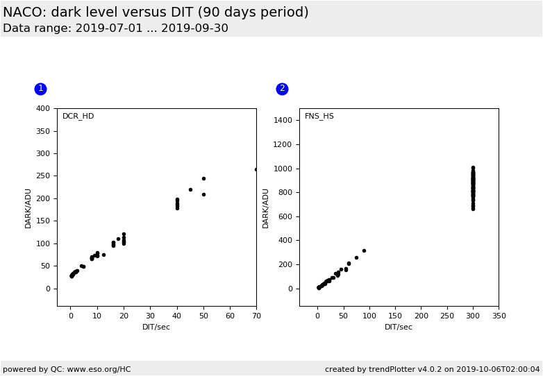 This plot shows the measured dark level as a function of exposure time (DIT) for two