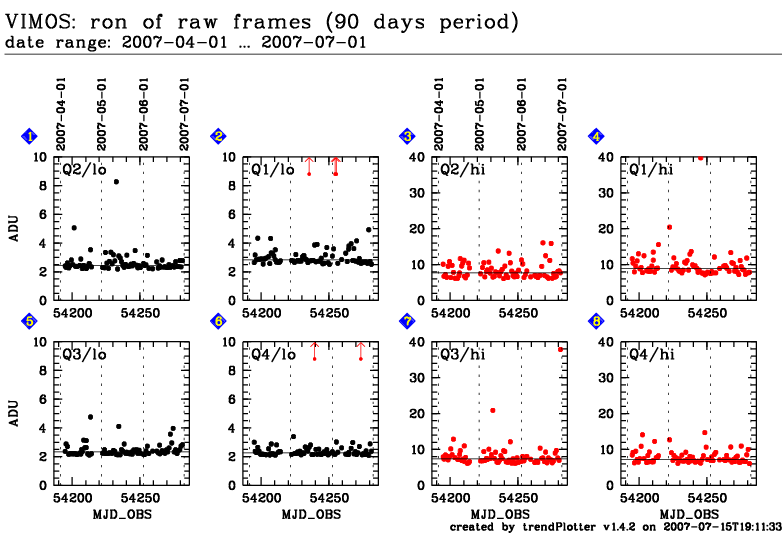 Trending plots for bias QC parameters. All bias parameters are measured in the central 1600x1800 pixels of the detectors. The median bias level and the rms of the master should show a stable trend without sudden jumps or increase/decrease. The read-out noise (ron_raw) is calculated from the difference of the first two raw frames. Some outliers with high values are occasionally observed due to cosmic ray events. The read-out noise as measured from master frames (ron_master) should be extremely stable. The new detectors (since July 2010) show a correlation of the bias level with temperature, especially for quadrant 2. Bias frames are usually measured daily during day-time. They come in two different varieties: with low gain (used for imaging) and with high gain (used to calibrate the spectroscopic modes).