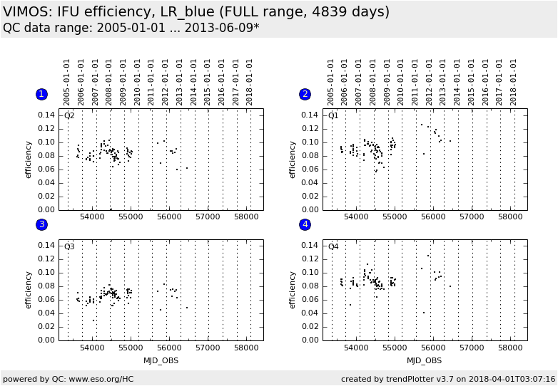 Trending plot for the overall IFU efficiency, measured using spectrophotometric standard stars.