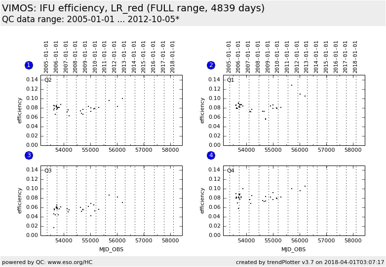 Trending plot for the overall IFU efficiency, measured using spectrophotometric standard stars.