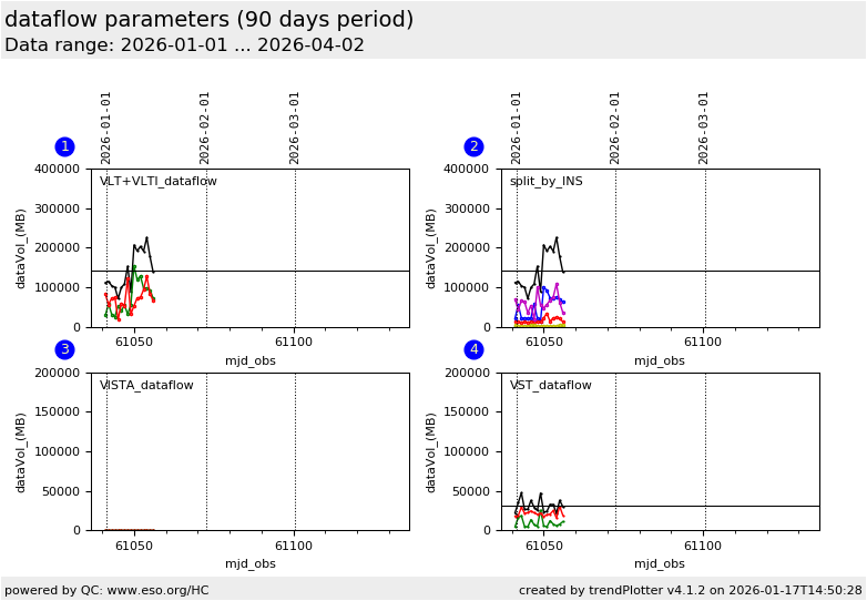 This plot visualizes the daily data volume, in compressed MBytes, created by VLT and VLTI (plots 1 and 2), by VISTA (plot 3) and by the VST (plot 4). The