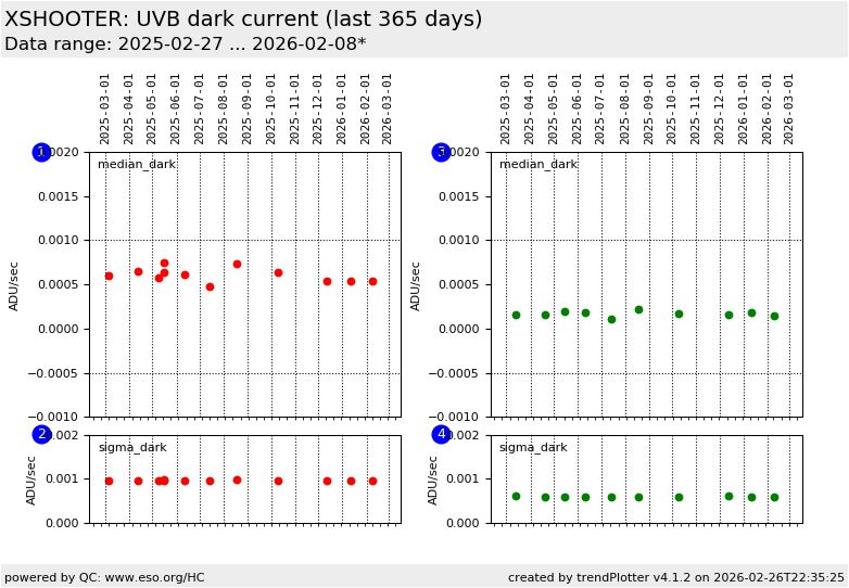 Dark frames are taken once per month with 1x1 bin for both low and high gain. The typical exposure time is 3600 sec. The XSHOOTER pipeline generates master DARKs from input raw DARKs with master BIAS subtracted. The dark current is computed from the median master dark frame level in ADU. For more information see the plot tutorial page.