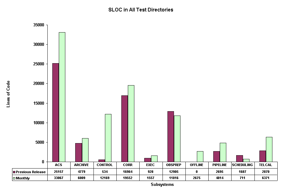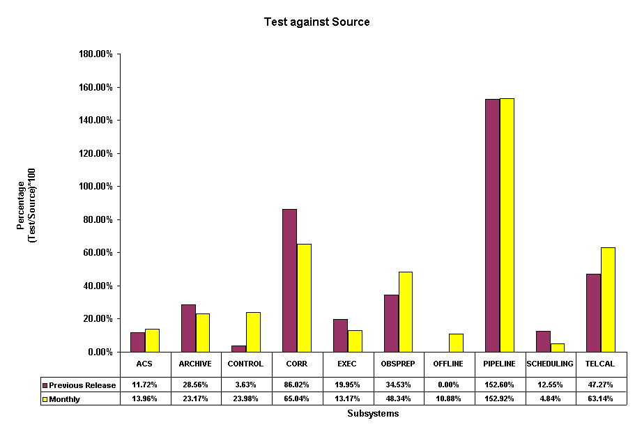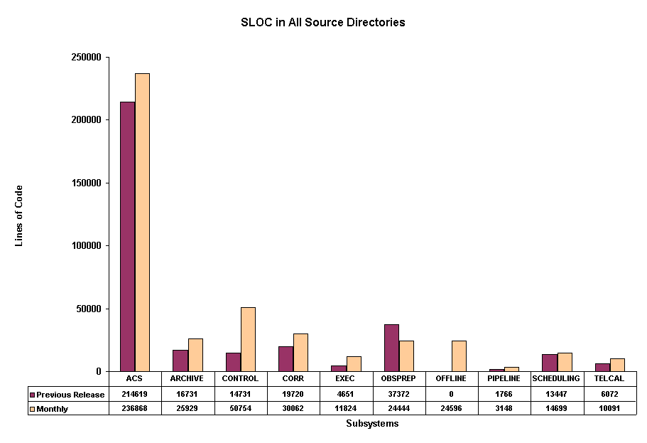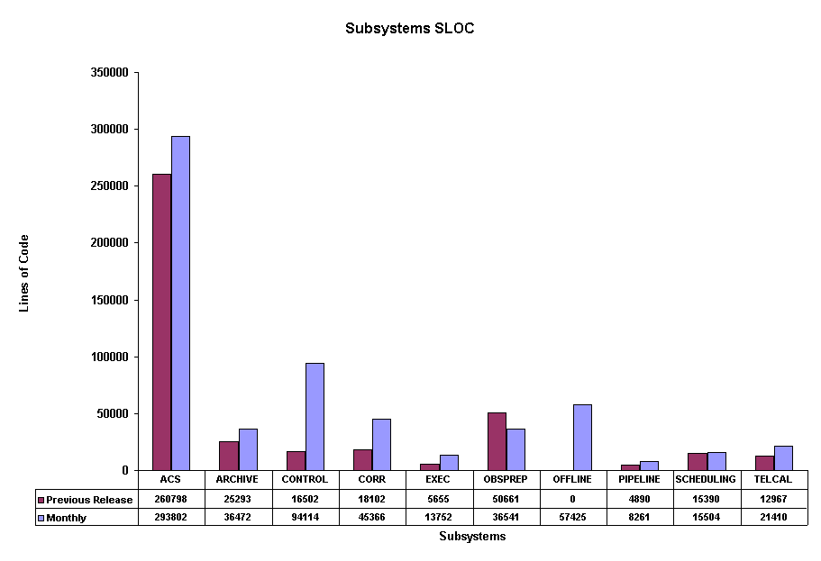 Note that we report the data and graphs for ACS and ARCHIVE too, just for comparison. The data are less interesting than for the other subsystems, because to ACS 3.1, already released and stable, not under development. Graphs and data for the next ACS-ARCHIVE release can be found at the ACS-ARCHIVE integration link.