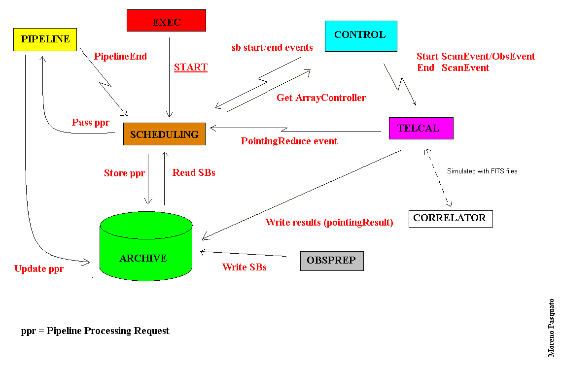 Via the ALMA-OT batch program a project, made up of four SBs, has been created and stored in the ARCHIVE.  The execmaster GUI is than used to start the entire cycle and to trigger the start up of the Master Scheduler. The Scheduler reads the archive to collect information about SBs. Each SB is sent to the Controller and CONTROL sends back SB start/end events to SCHEDULING. CONTROL also starts the telescope calibration sending Scan/Obs events to TELCAL. Data reduction is then performed with CORR in simulation (in this case TELCAL uses test FITS files prepared by TELCAL itself) or not (in this case CORR sends test data, still simulated because of lack of the hardaware). At the end of the data reduction a PointingReduce event is sent from TELCAL to SCHEDULING and results are written in the ARCHIVE. SCHEDULING stores ppr and passes it to PIPELINE. At this point PIPELINE updates the ppr and stores it in the ARCHIVE. At the end, when the entire project has been processed, PIPELINE sends an end event to SCHEDULING.