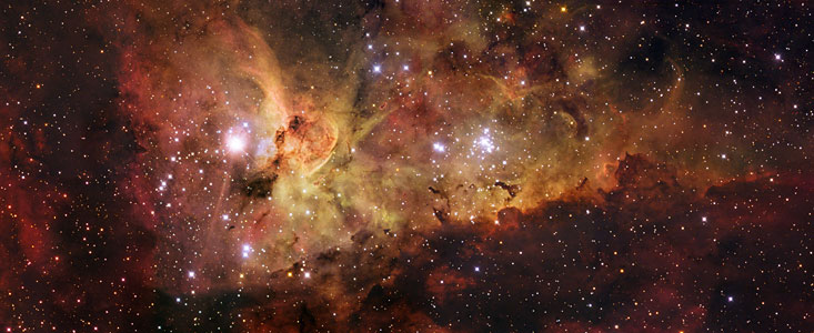 Mjegullnaja e Karinës është një mjegullnajë e madhe e ndritshme që rrethon disa grumbullime yjore. Përmban dy nga yjet më të ndritshëm dhe më masivë të galaktikës sonë, Rrugës së Qumështit, Eta Carinae dhe HD 93129A, të lokalizuar 7500 vite-dritë larg, vetë mjegullnaja shtrihet rreth 260 vite-dritë, afërsisht 7 herë më shumë se Mjegullnaja e Orionit, dhe shfaqet me të gjithë madhështinë e saj në këtë mozaik, i cili është bazuar mbi pamjet e mbledhura me teleskopin danez prej 1.5 metrash në Observatorin Silla të ESO-s.
