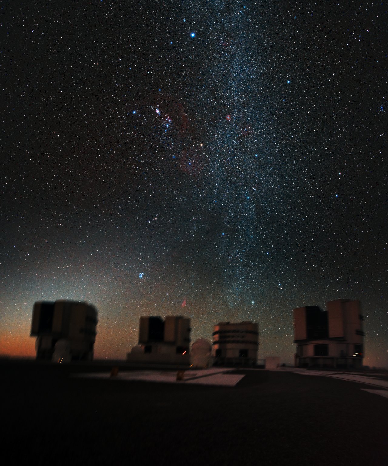Në plan të parë është peisazhi malor dramatik i shkretëtirës së Atacama-s. Në të majtë, në majën më të lartë është ESO, Teleskopi Shumë i Madh, (Very Large Telescope, VLT), dhe përpara tij paksa më poshtë, është Teleskopi VISTA, teleskopi për astronominë që shikon dritën e dukshme dhe atë infra të kuqe, (Visible and Infrared Survey Telescope for Astronomy).