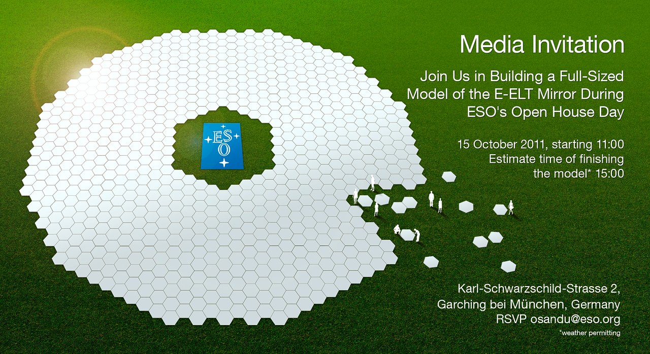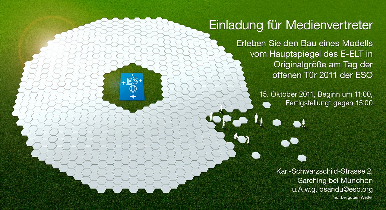 Vertreter der Medien sind herzlich eingeladen, live dem Nachbau des 40-Meter-Spiegels des geplanten European Extremely Large Telescope (E-ELT) in Originalgröße beizuwohnen. Die Veranstaltung findet – gutes Wetter vorausgesetzt – am Samstag, dem 15. Oktober 2011 von 11:00 bis 18:00 am Hauptsitz der Europäischen Südsternwarte (ESO) in Garching bei München statt.