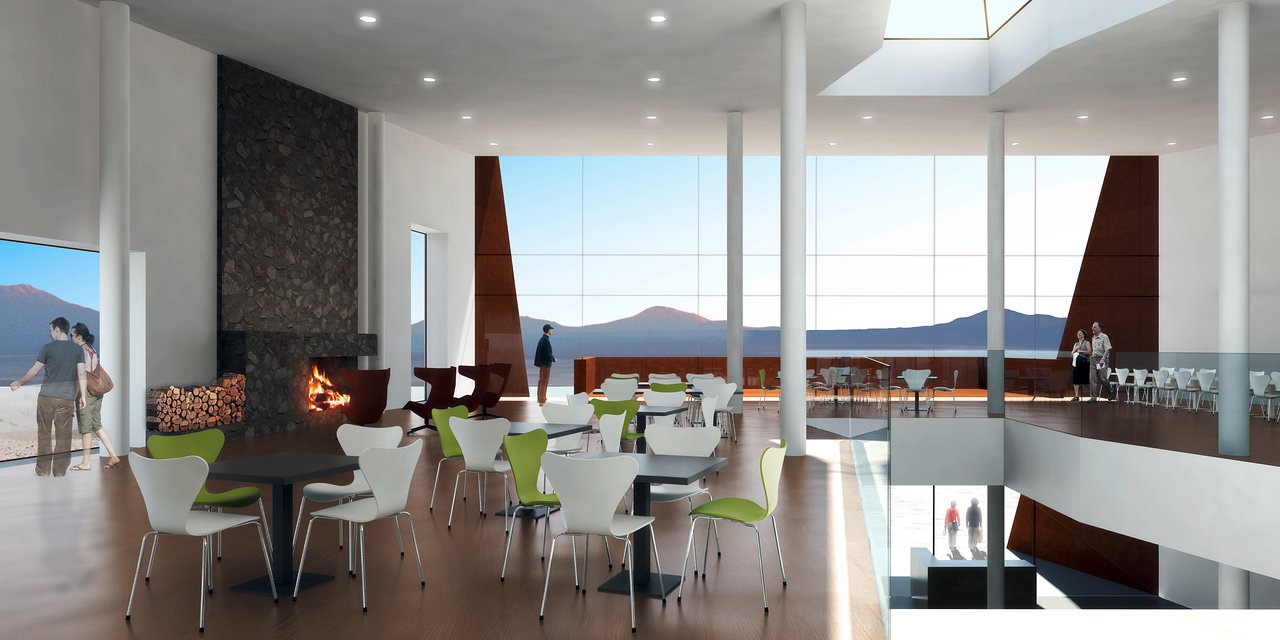The roof terrace will provide scenic views of the breathtaking landscape: the Salar de Atacama stretching below, the extinct Licancabur volcano about 35 kilometres to the north and the active Lascar volcano about 50 kilometres to the south. There will also be an observation point for stargazing with an amateur telescope.