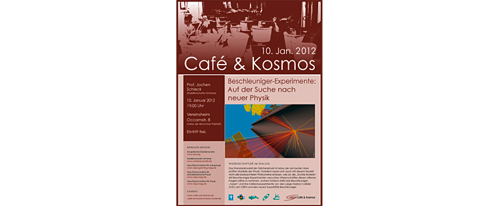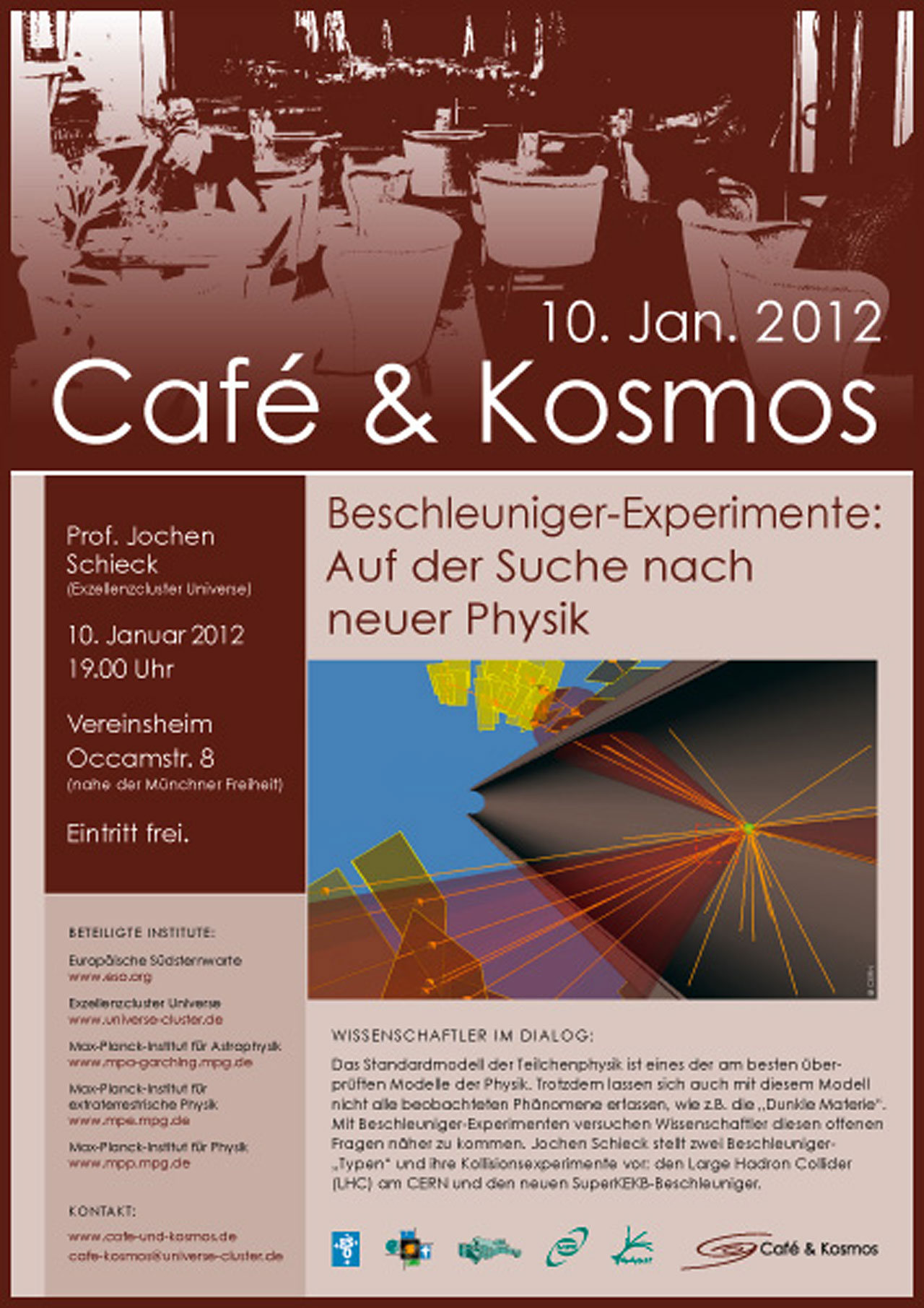 At Café & Kosmos on 10 January 2012, Professor Jochen Schieck (Excellence Cluster Universe) will describe two new accelerators before discussing their collision experiments: the Large Hadron Collider (LHC) at CERN and the new Super KEKB accelerator, which will start up in 2014, from the Japanese High Energy Accelerator Research Organisation, KEK. While the experiments at the LHC are tuned for very high energies, the physicists are adjusting the "newcomer" Super KEKB for maximum precision. Jochen Schieck will discuss with the visitors of the Café & Kosmos why both approaches are important in order to expand our understanding of physics.