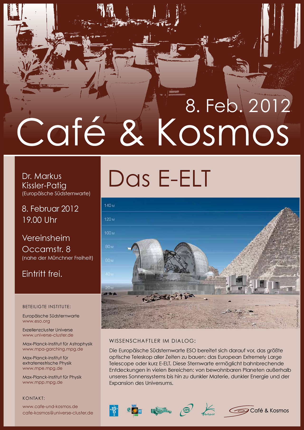 He will discuss with the guests of Café & Kosmos why such a challenge is worthwhile: this observatory will allow ground-breaking discoveries in many fields. For the first time, we will be technically capable of not only detecting, but also characterising habitable planets beyond the Solar System. We will also be able to measure the expansion of the Universe directly and learn more about the mysterious dark matter and dark energy.