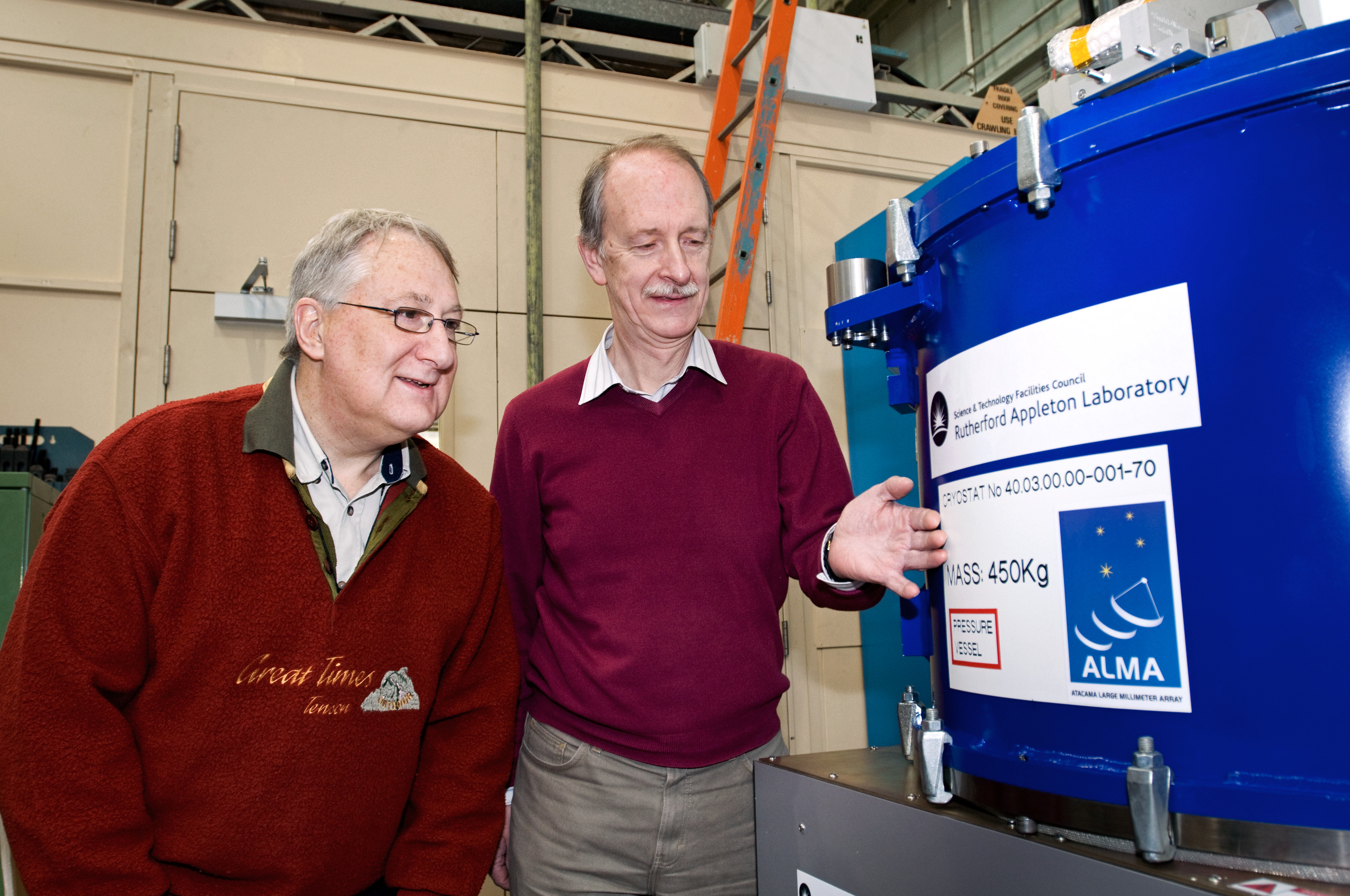 ESO Liaison Officer Peter Hekman (links) und der britische ALMA-Projektmanager Brian Ellison (rechts) begutachten das letzte ALMA-Empfangsmodul, das das RAL verlässt.
