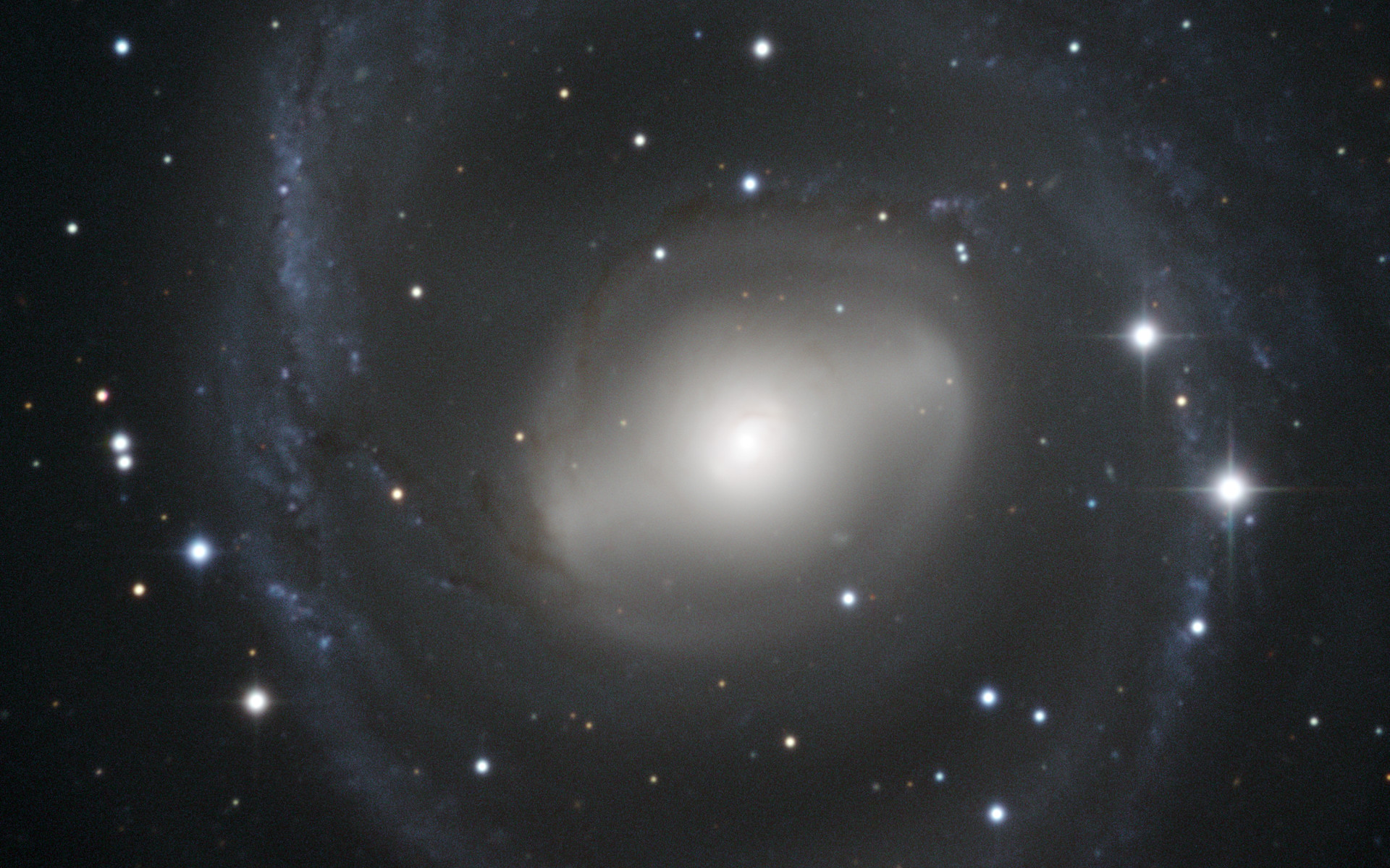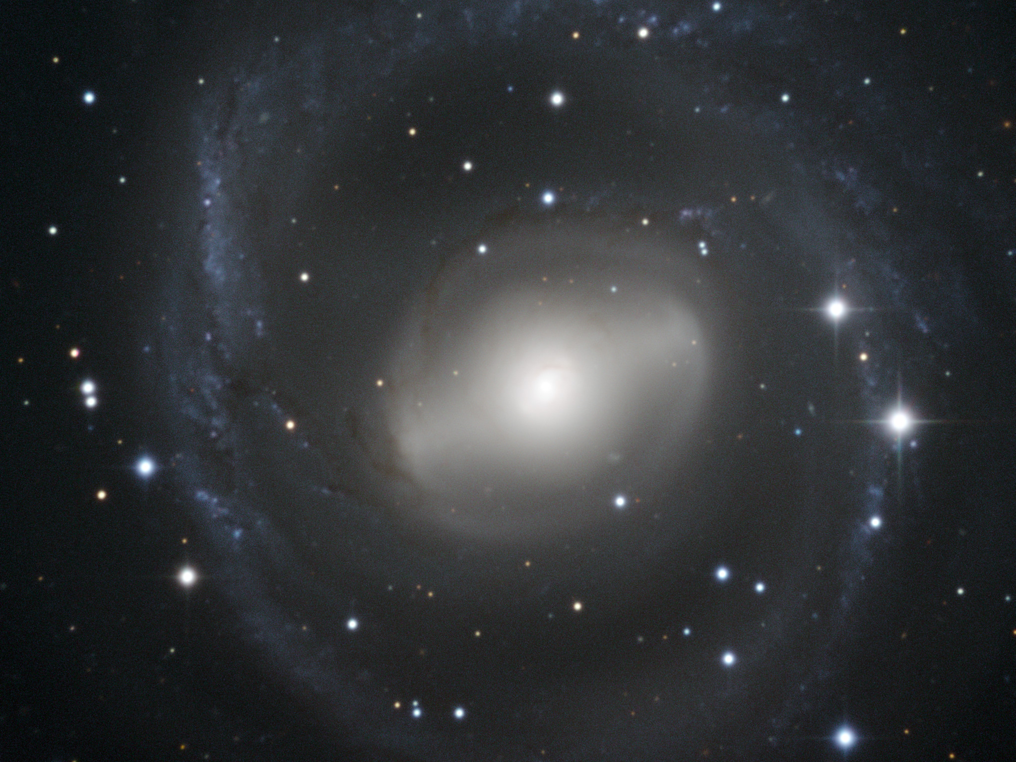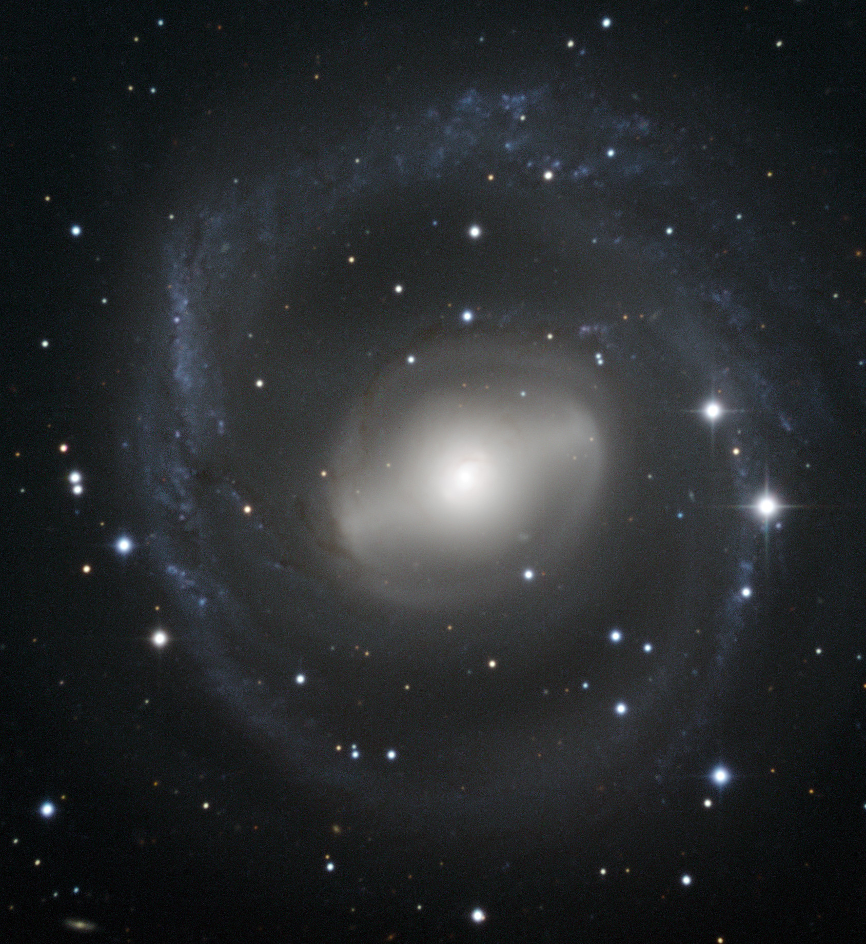 Dieses Bild zeigt das quirlige Aussehen der Galaxie NGC 2217, die sich im Sternbild Canis Major (der Große Hund) befindet. In der Mitte dieser Galaxie befindet sich ein ausgeprägter Balken aus Sternen, umgeben von einem ovalen Ring. Weiter außen bilden mehrere eng gewundene Spiralarme einen nahezu kreisförmigen Ring um die Galaxie. NGC 2217 ist daher als Balkenspirale klassifiziert. Ihre kreisförmige Erscheinung deutet darauf hin, dass wir praktisch von oben auf sie schauen.