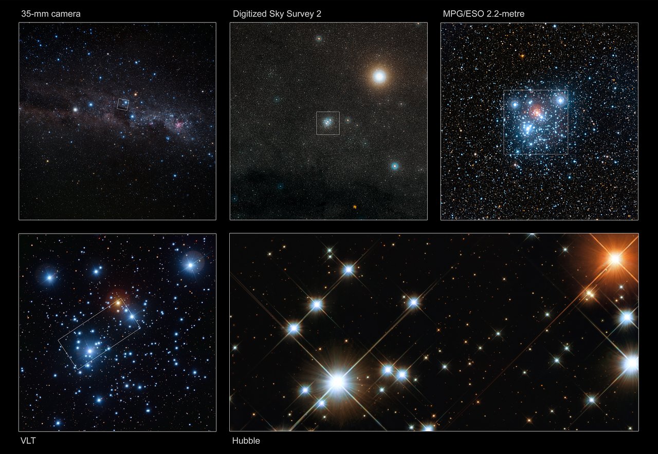 Die Kombination dreier Bilder dreier außergewöhnlicher Teleskope – des VLT der ESO auf dem Cerro Paranal, des MPG/ESO 2,2-Meter-Teleskops am La Silla-Observatorium der ESO und des Weltraumteleskops Hubble (NASA/ESA) – lässt “Herschels Schmuckkästchen”, einen offenen Sternhaufen am Südhimmel, in nie gesehener Pracht erstrahlen.