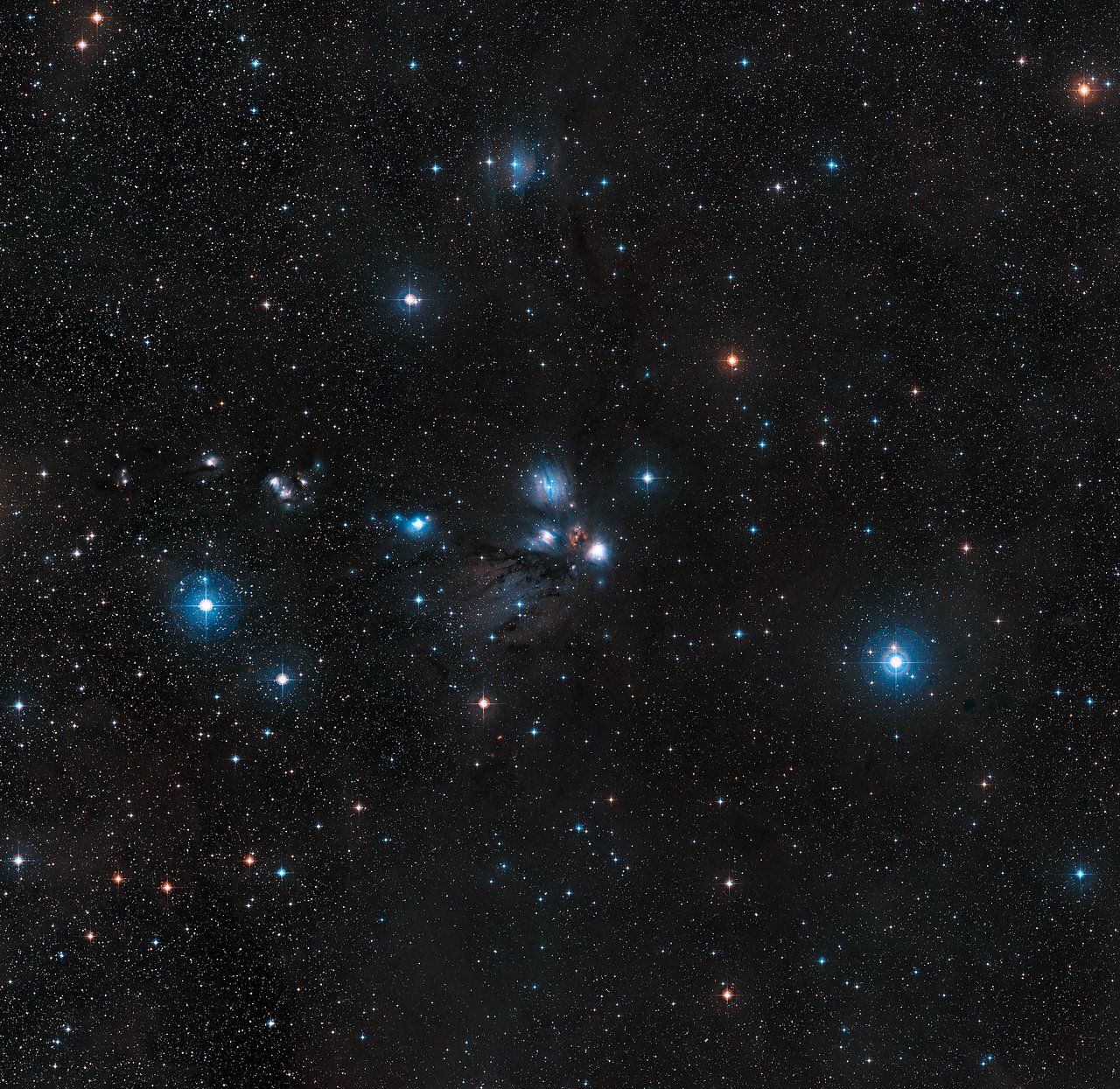 Das Visible and Infrared Survey Telescope for Astronomy (etwa “Astronomisches Durchmusterungsteleskop für das sichtbare und und infrarote Licht”, kurz VISTA [1], eso0949) am Paranal-Observatorium der ESO in Nordchile kann den dunklen Vorhang aus kosmischem Staub dank seiner Fähigkeit, Infrarotlicht zu beobachten, durchdringen. Seine Bilder zeigen komplexe Strukturen, die durch die Wechselwirkung der intensiven Strahlung und der starken Teilchenströme („Sternwind“) der jungen Sterne mit dem Staub der Molekülwolke – ein kosmisches Netzwerk von Schlaufen, Bögen und Filamenten.