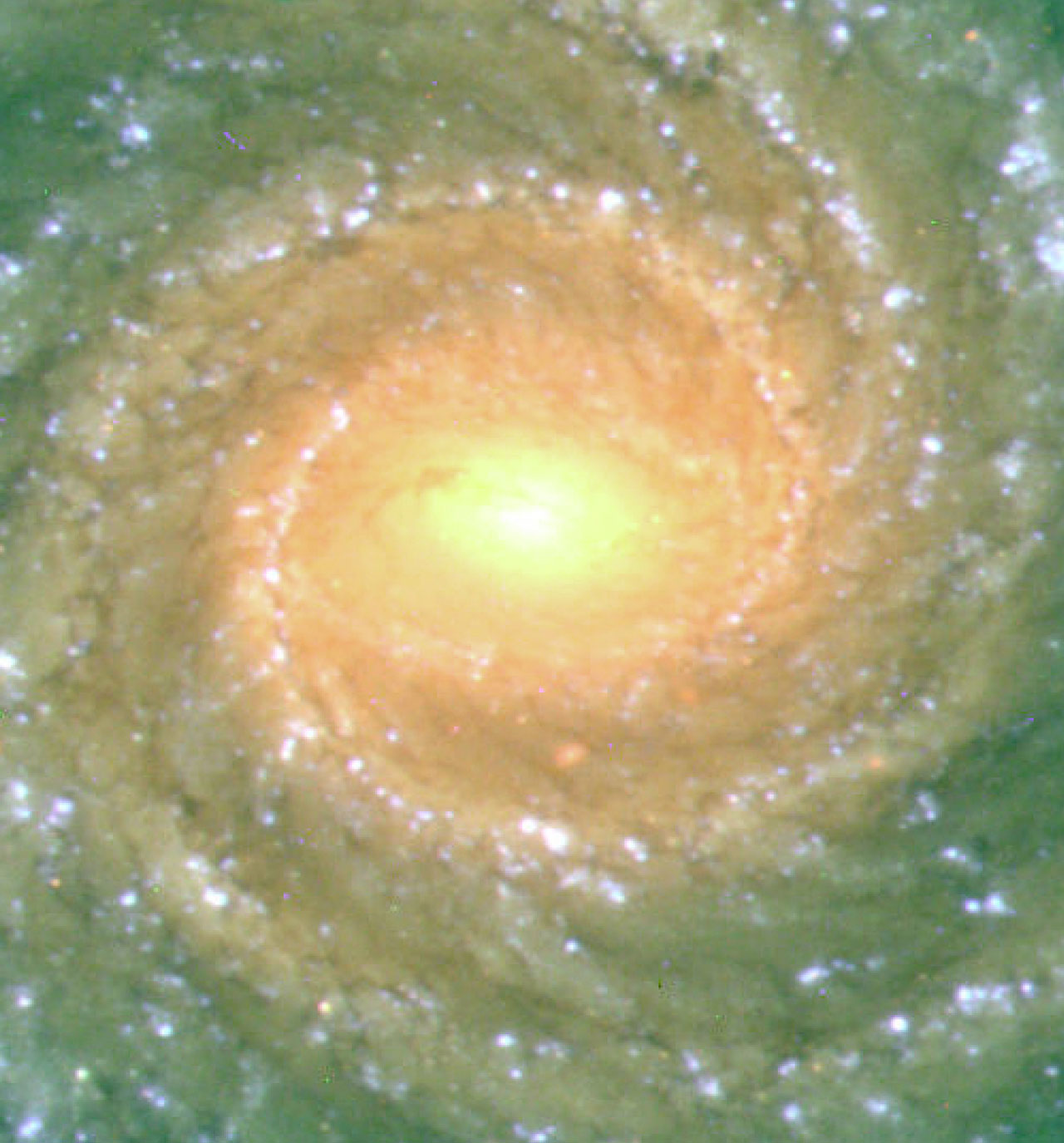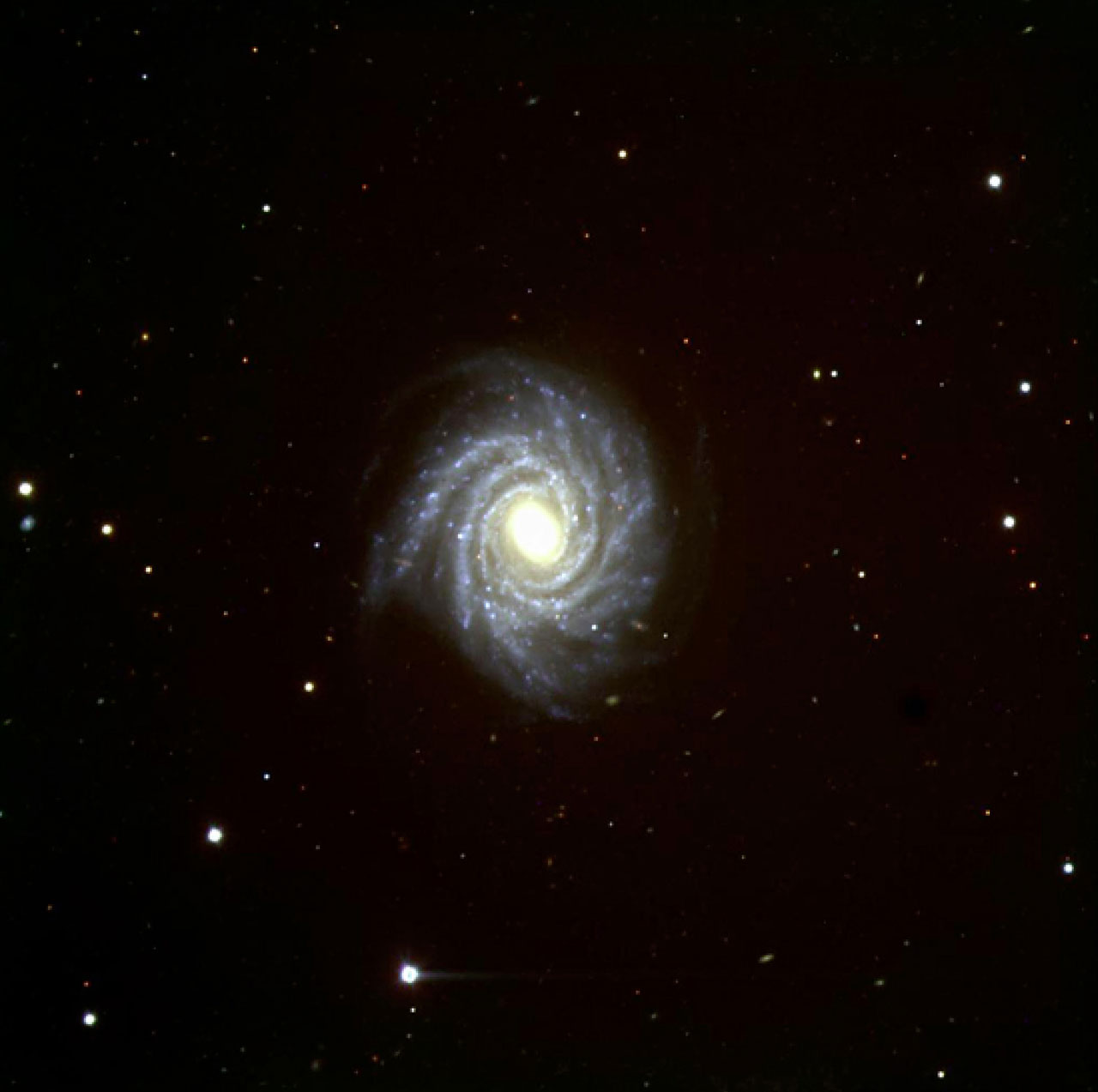 Das erste Photo zeigt eine Dreifarbenaufnahme der schönen Spiralgalaxie NGC 1288 im südlichen Sternbild Fornax. PR Photo eso9845a umfaßt das gesamte Feld, das mit der 2048 x 2048 Pixel großen CCD-Kamera abgebildet wurde. Es wurde aus drei CCD-Aufnahmen zusammengesetzt, die bei gutem Seeing in verschiedenen Farben in der "Nacht des ersten Lichts" (15. September 1998) aufgenommen wurden. Diese Galaxie mit einem Durchmesser von rund 200000 Lichtjahren ist etwa 300 Millionen Lichtjahre entfernt, ihre Fluchtgeschwindigkeit beträgt 4500 km/sec.